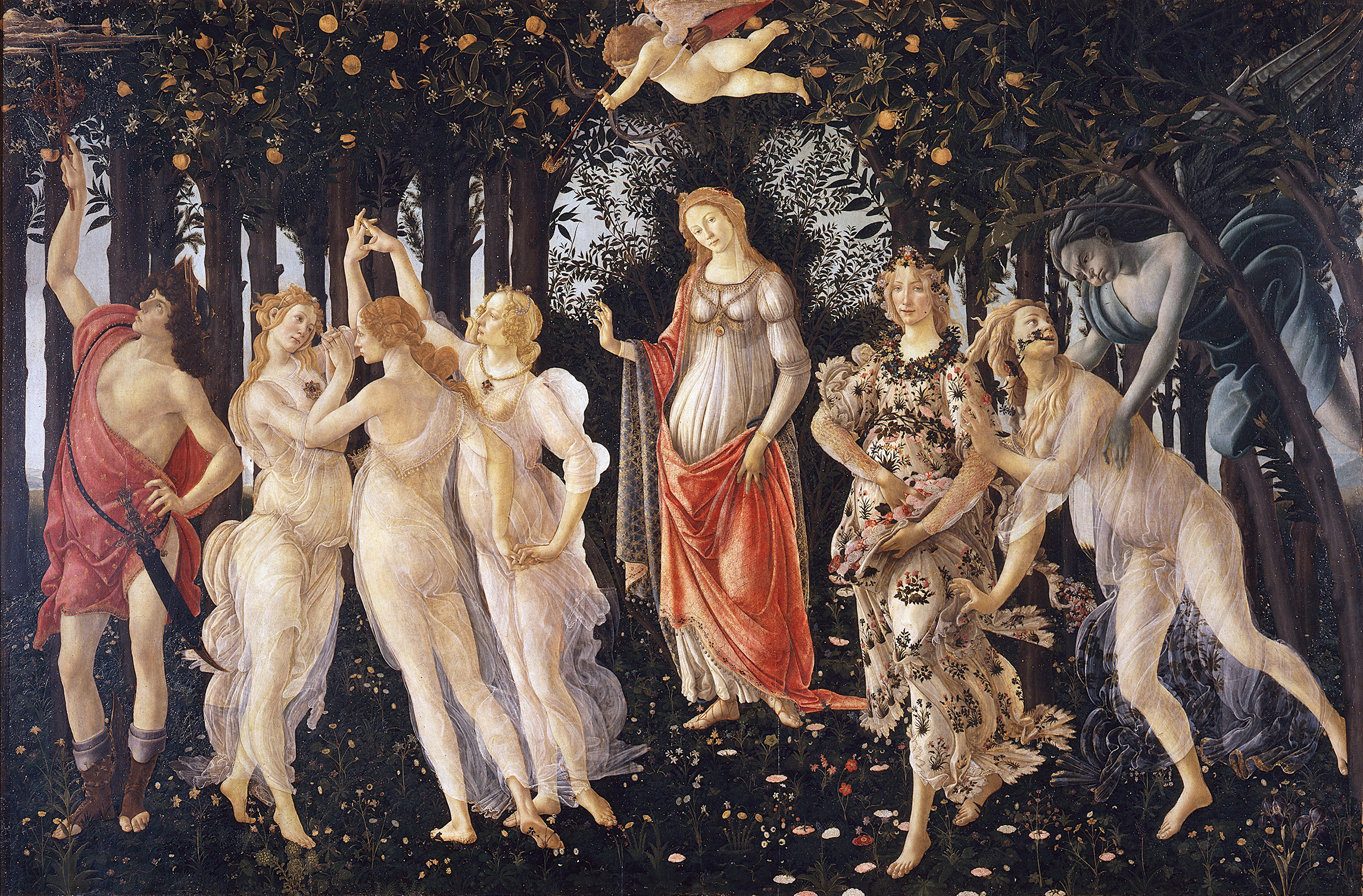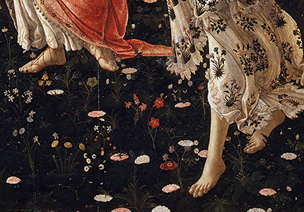 I piedi delle figure calpestano un tappeto di erbe medicinali e magiche: questo richiama la pratica degli unguenti. Il contatto tra il piede e l’erba specifica trasmette l’influsso dei pianeti dal suolo al corpo della divinità. il prato di Botticelli è uno specchio del cielo. I piedi calpestano le piante perché esse sono la “precipitazione materiale” delle stelle (come nelle Segnature di Paracelso). Quindi, camminando sul prato, le figure stanno in realtà camminando su un cielo terrestre, ricaricandosi della virtù stellare che le piante hanno estratto dal suolo.