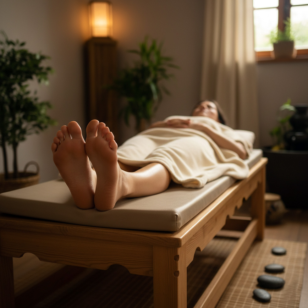 L’analogia esteriore più evidente tra Śavāsana e la ricezione di un trattamento di Riflessologia Plantare risiede nella posizione supina. In entrambi i casi, il corpo giace piatto sulla schiena (faccia in su), con gli arti leggermente distanziati.5 Questa posizione è specificamente scelta perché massimizza il contatto corporeo con la superficie di supporto (pavimento o lettino).